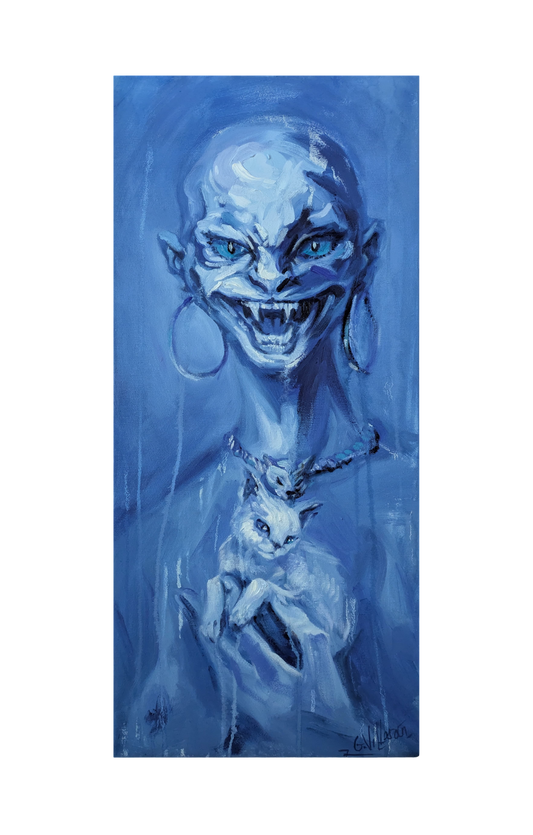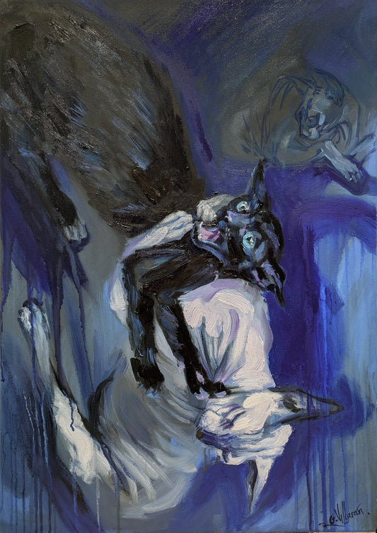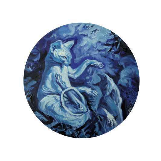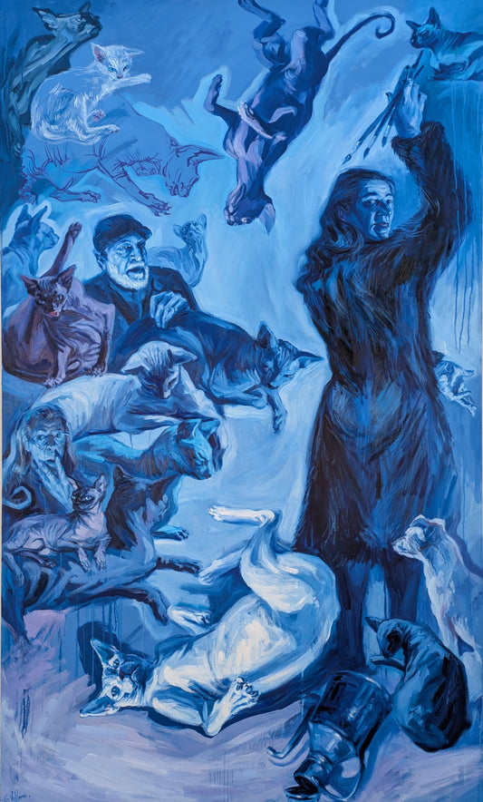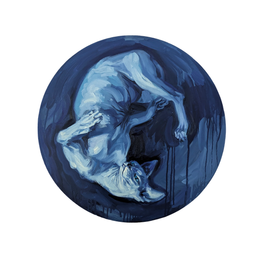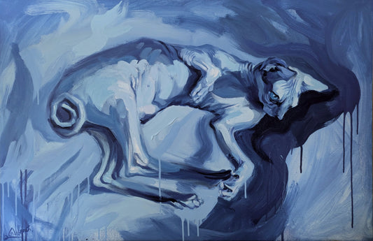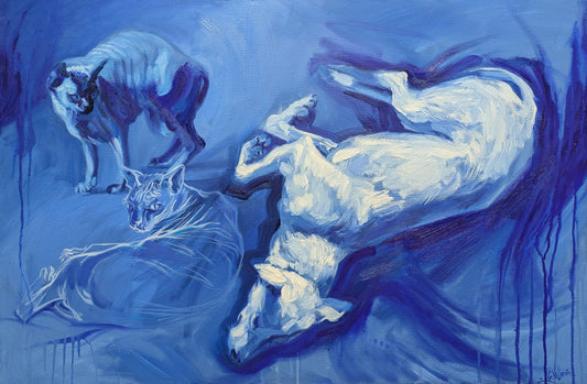"Sueños de gatos azules" es una colección que se desliza por los márgenes del sueño, donde la vigilia se funde con lo imposible. 13 óleos únicos que retratan un universo íntimo y onírico, En estas obras, los cuerpos se pliegan y estiran como pensamientos, flotando en un mar de pinceladas líquidas.