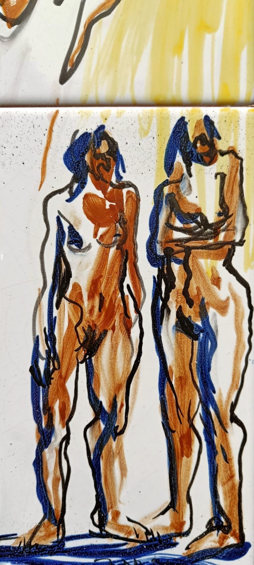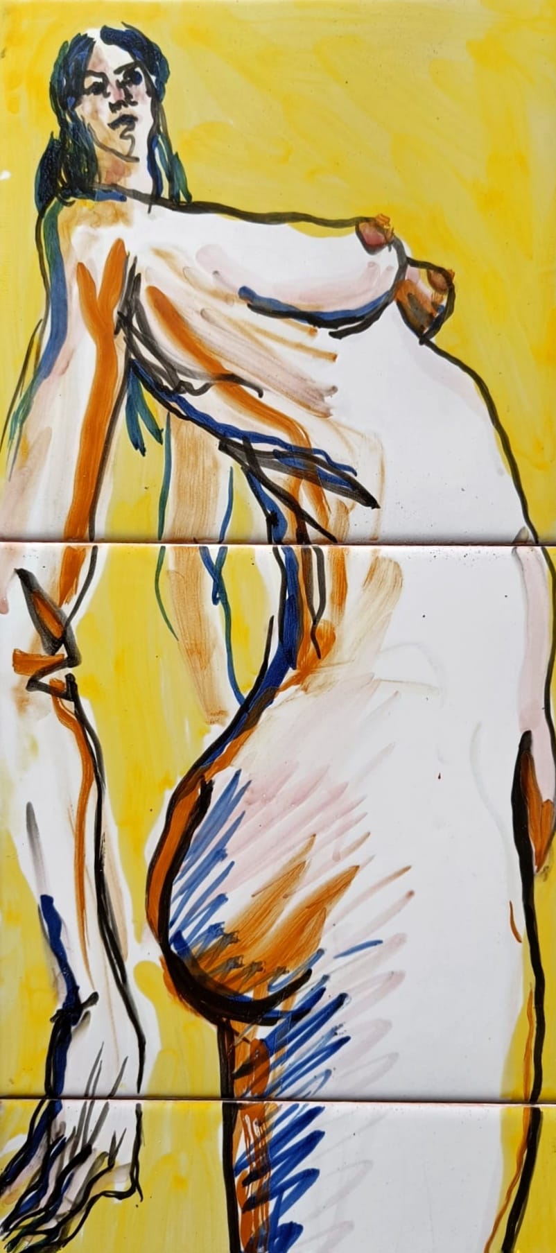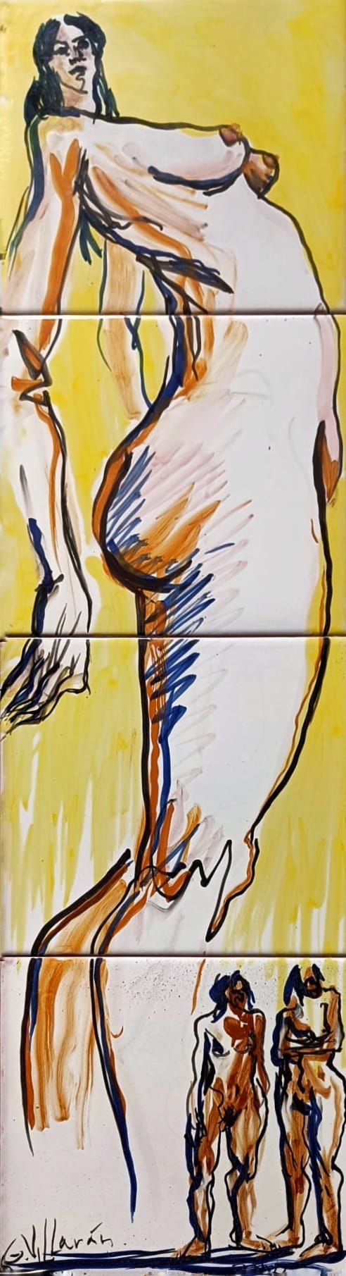 Pintada con óxidos sobre azulejos, esta pieza es uno de sus primeros ejercicios cerámicos y, al mismo tiempo, un germen claro de lo que más tarde se convertiría en un motivo recurrente en su obra: las mujeres gigantes. En el centro de la composición, una figura femenina monumental se impone sobre otras dos figuras más pequeñas, generando un juego de escalas que trasciende lo físico para hablar de presencia, de poder y de la mirada propia.