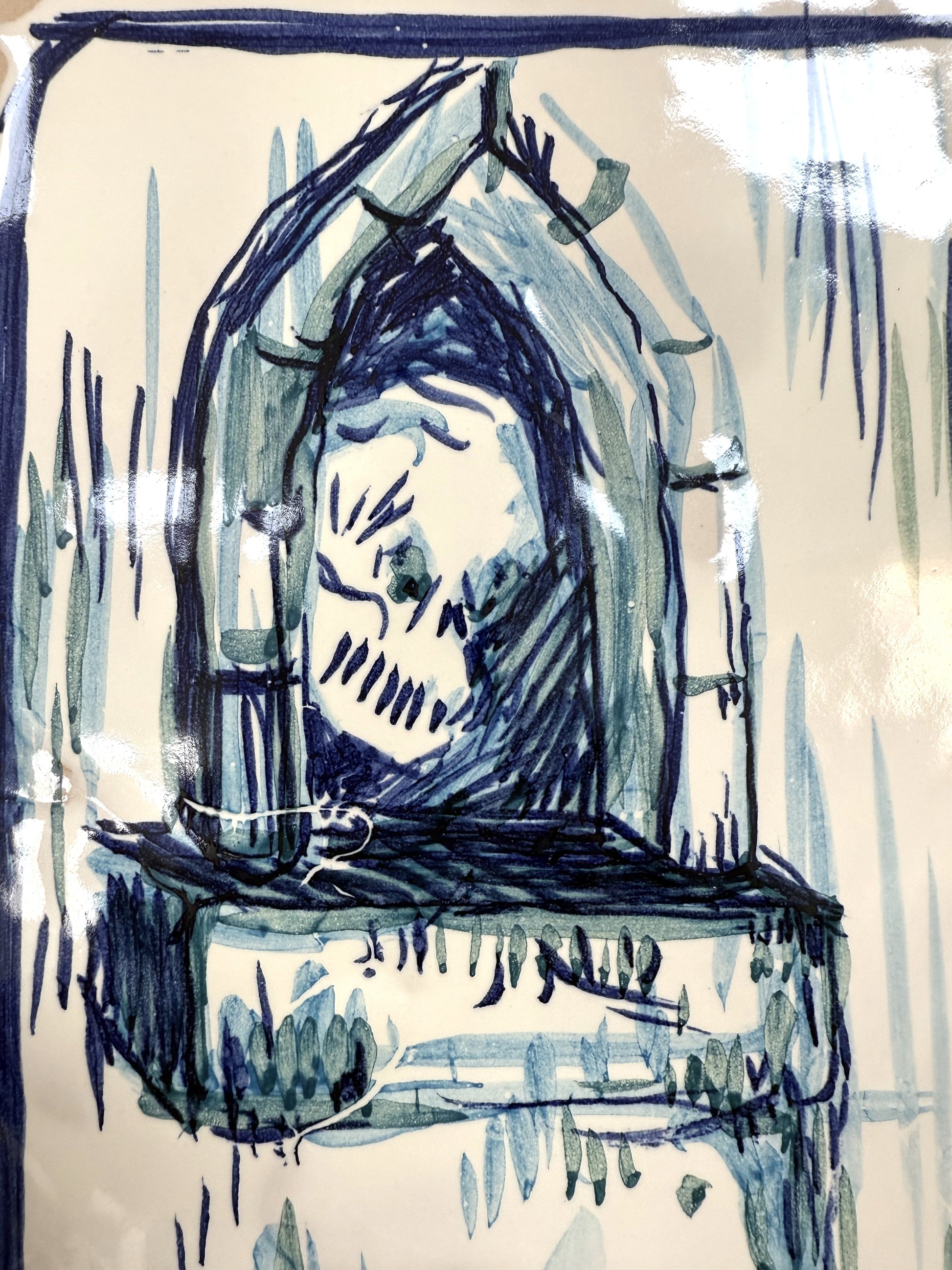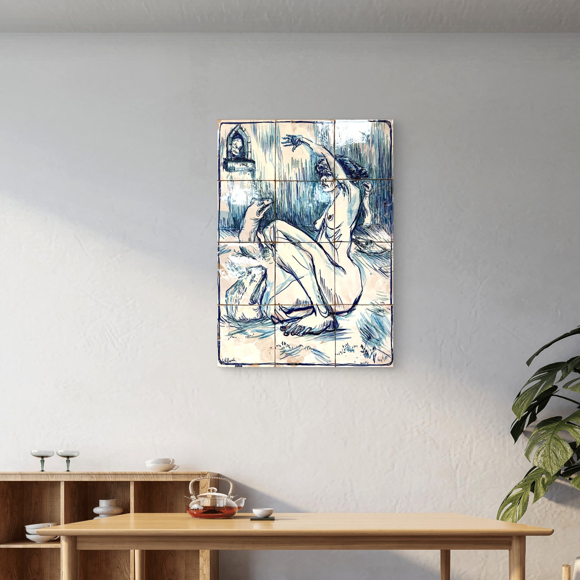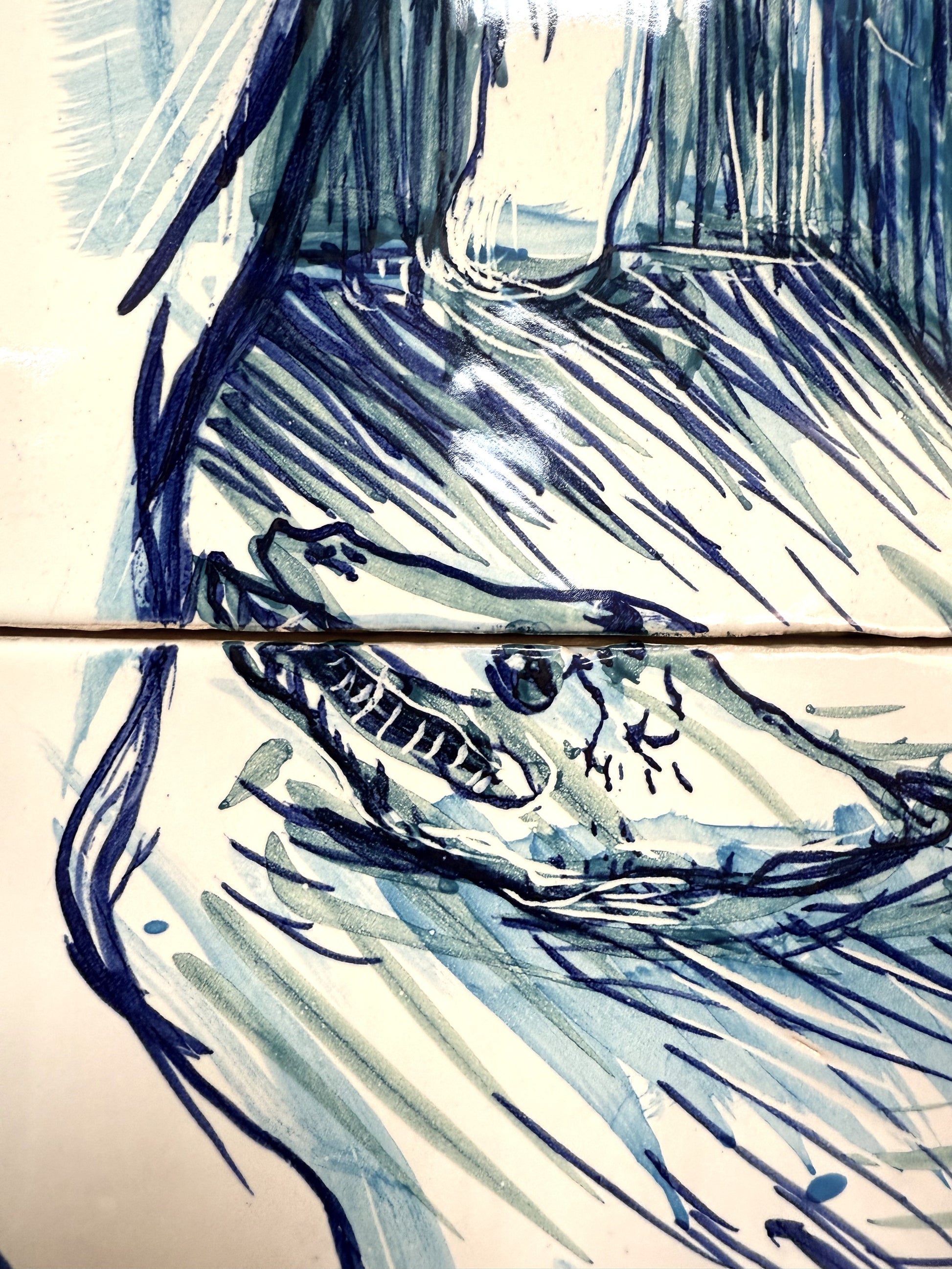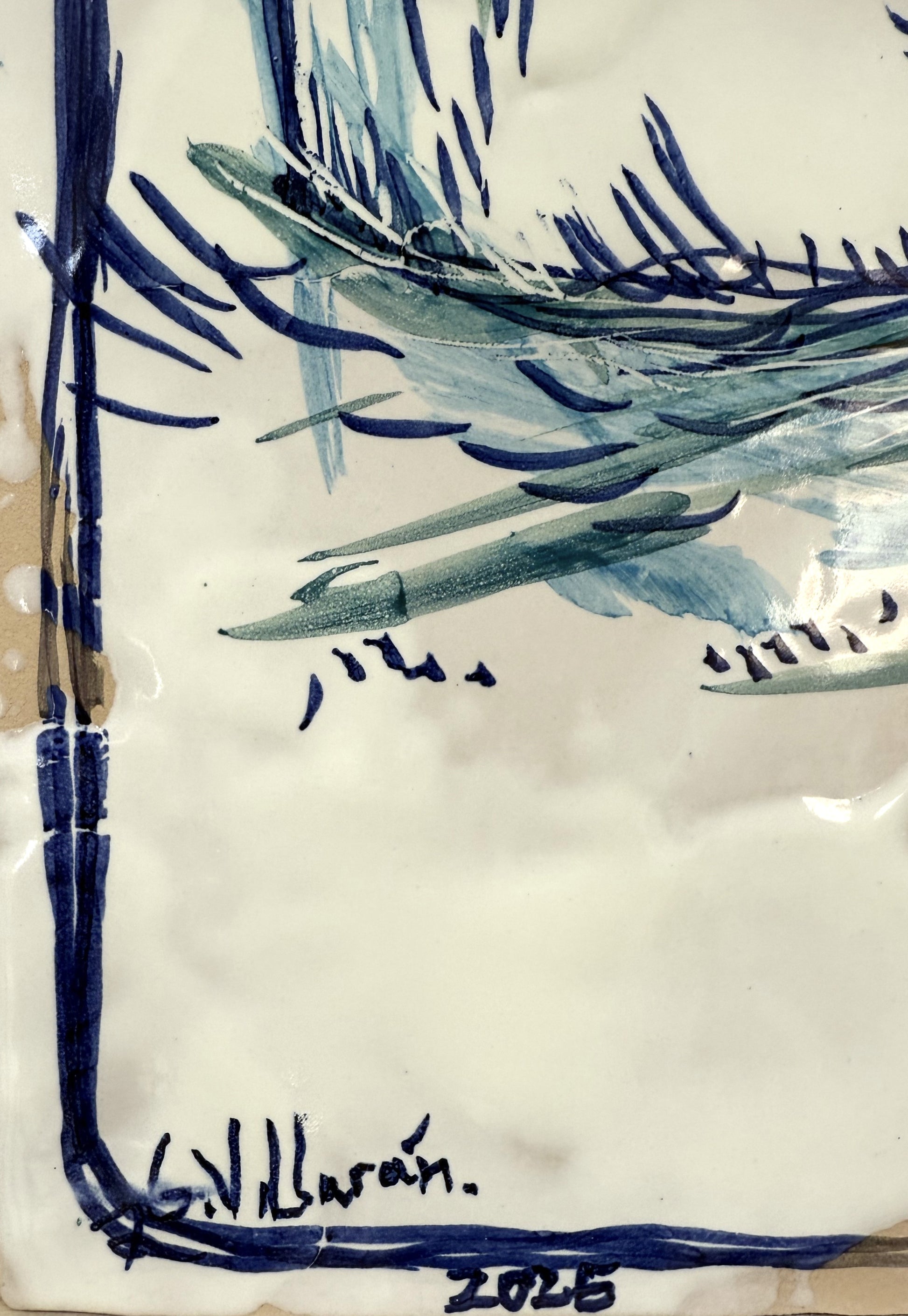 Técnica: Esmalte sobre cubierta sobre bizcocho de 20 x 20 x 0,2 cm de barro blanco.