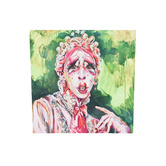"La Llorona." Cette œuvre grand format représente ma muse Drag préférée, Hugaceo Crujiente. J'ai eu l'occasion de la rencontrer, j'ai même dîné avec elle pour enquêter et découvrir ses secrets de création. Dans ce portrait si plein de couleurs, aux tons rosés, plein de perles et de maquillage spectaculaire, on peut aussi voir une partie de la tragédie qu'il contient. Pour moi, cela symbolise une enfance difficile dans laquelle une personne qui a ces préoccupations ne s’intègre pas. Malgré cela, elle a réussi à transformer sa faiblesse en force, et elle se présente à nous comme une grande Diva qui pleure, avec des yeux comme des boucles d'oreilles, une belle dentelle et des gants assortis. Son regard dit tout.