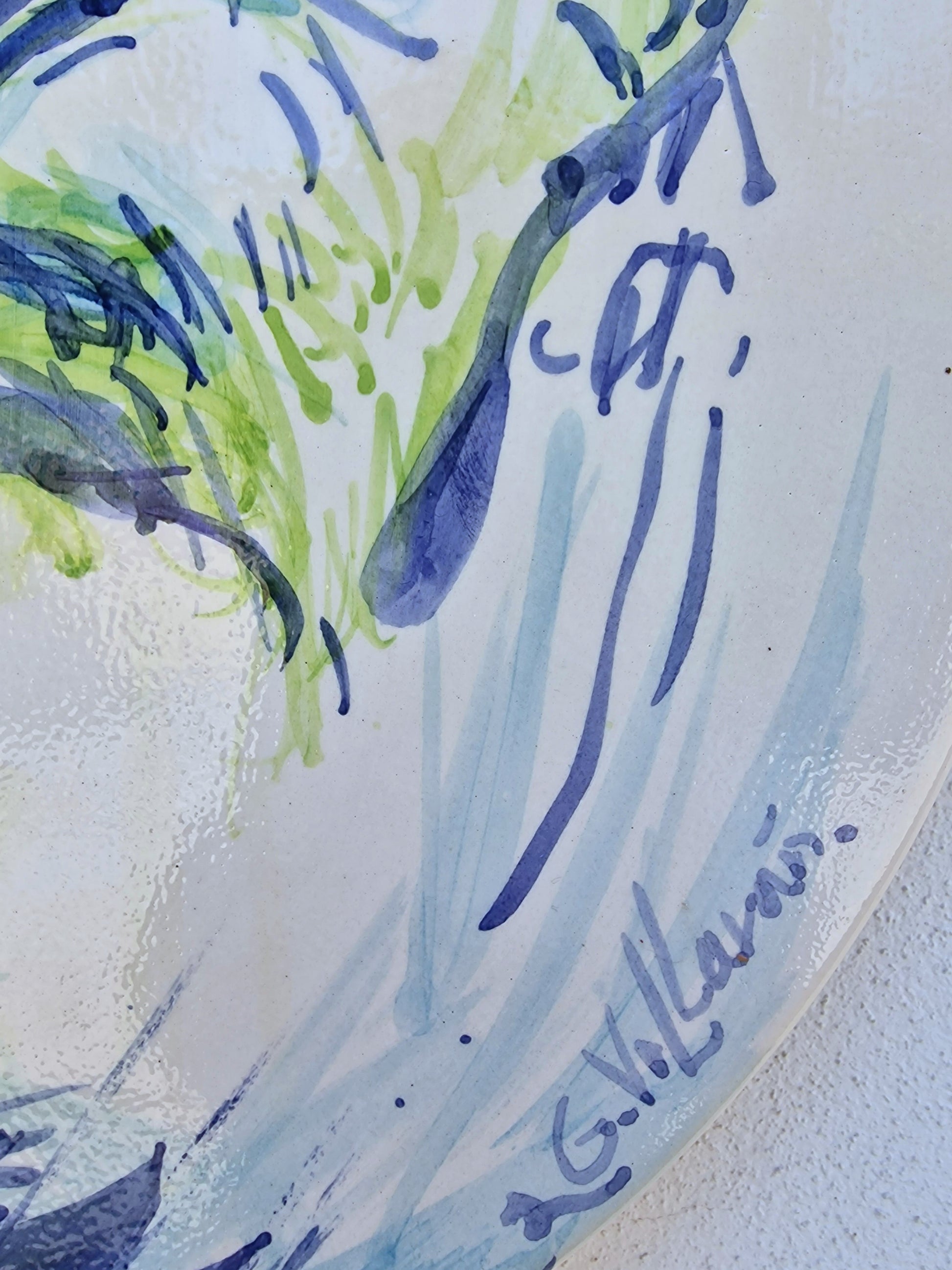 Técnica: esmalte bajo cubierta sobre plato cerámico llano de barro blanco.