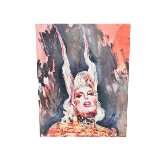 Reina Zafiro” es un retrato de uno de los loocks más característicos de esta Drag Queen. Ella utiliza los cabellos de su peluca para convertirlos en cuernos que a veces parecen llamas de fuego. Todo en ella es exagerado, Camp, y a la vez me resulta todo muy natural y artístico. Tiene argollas en el cuello que actúan como un gran collar de lo más lujoso. Nos mira desde un lugar lejano, puesto que para llegar donde ella ha llegado, habría que vivir lo que ella ha vivido.