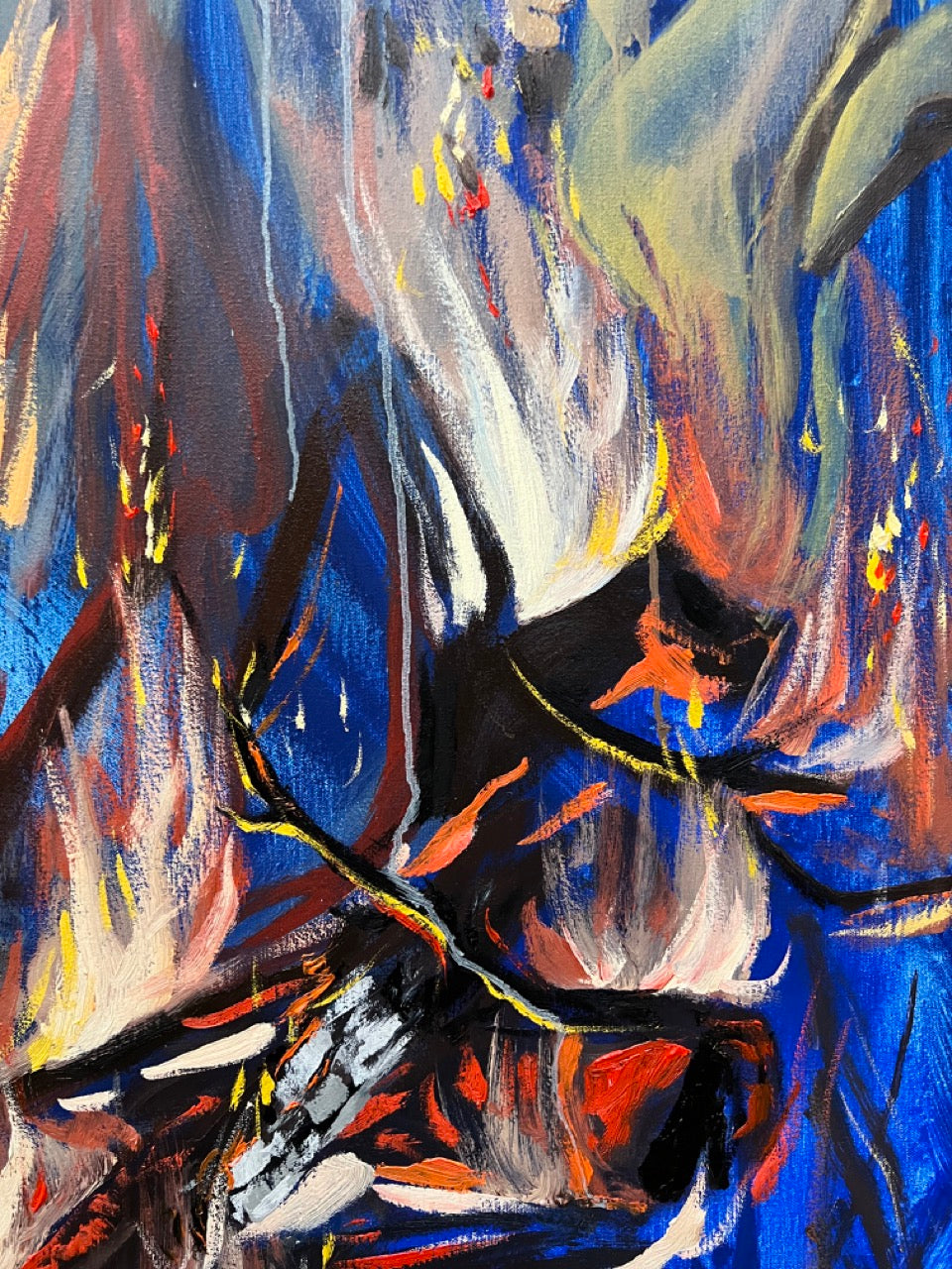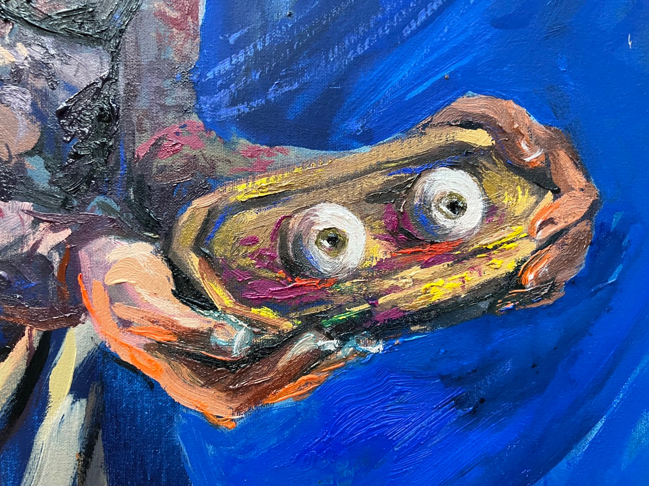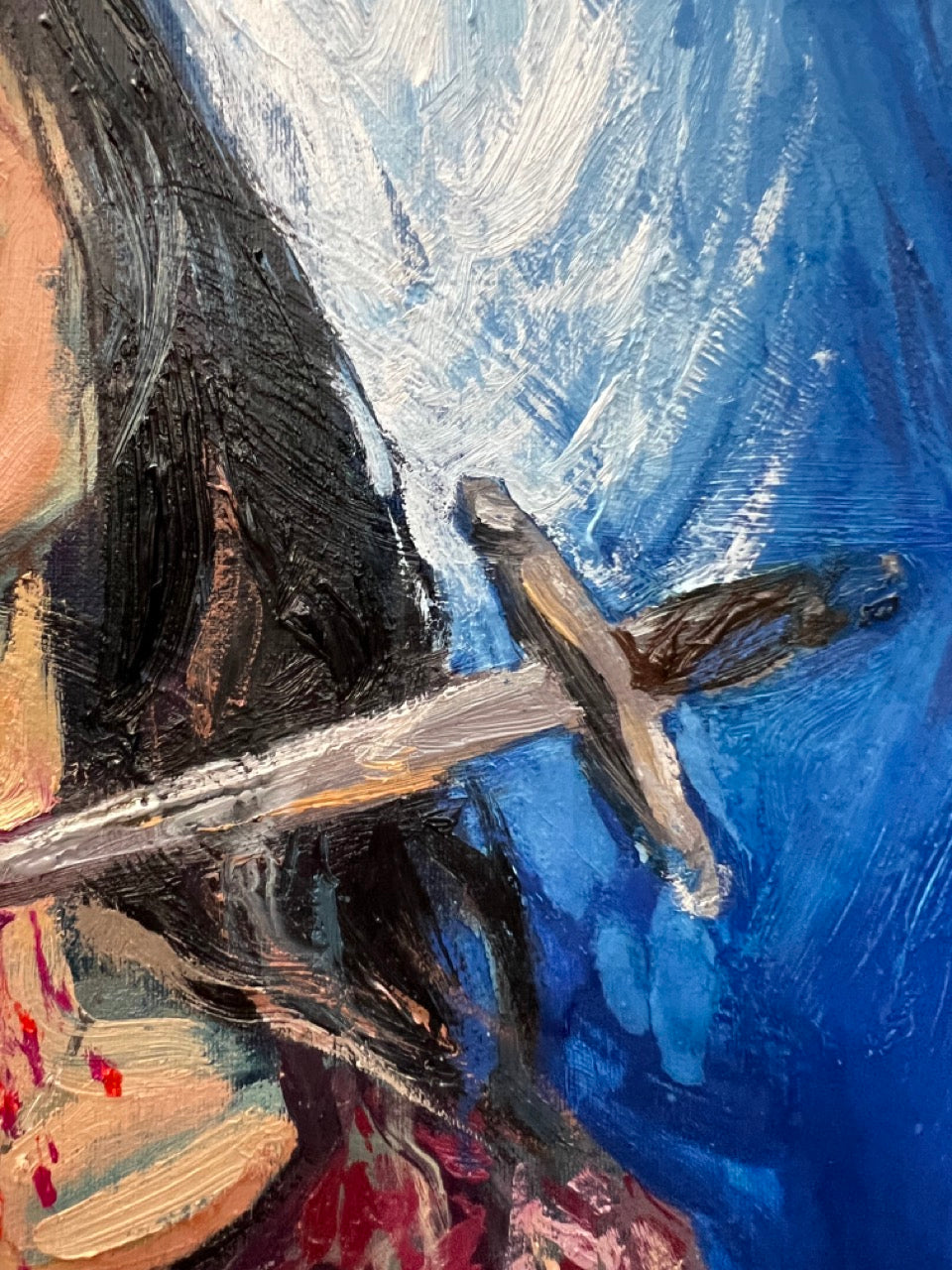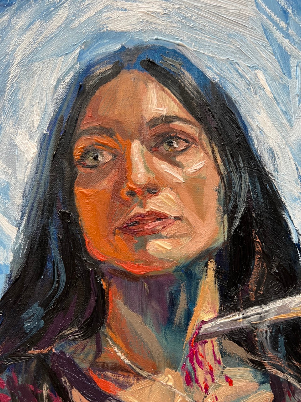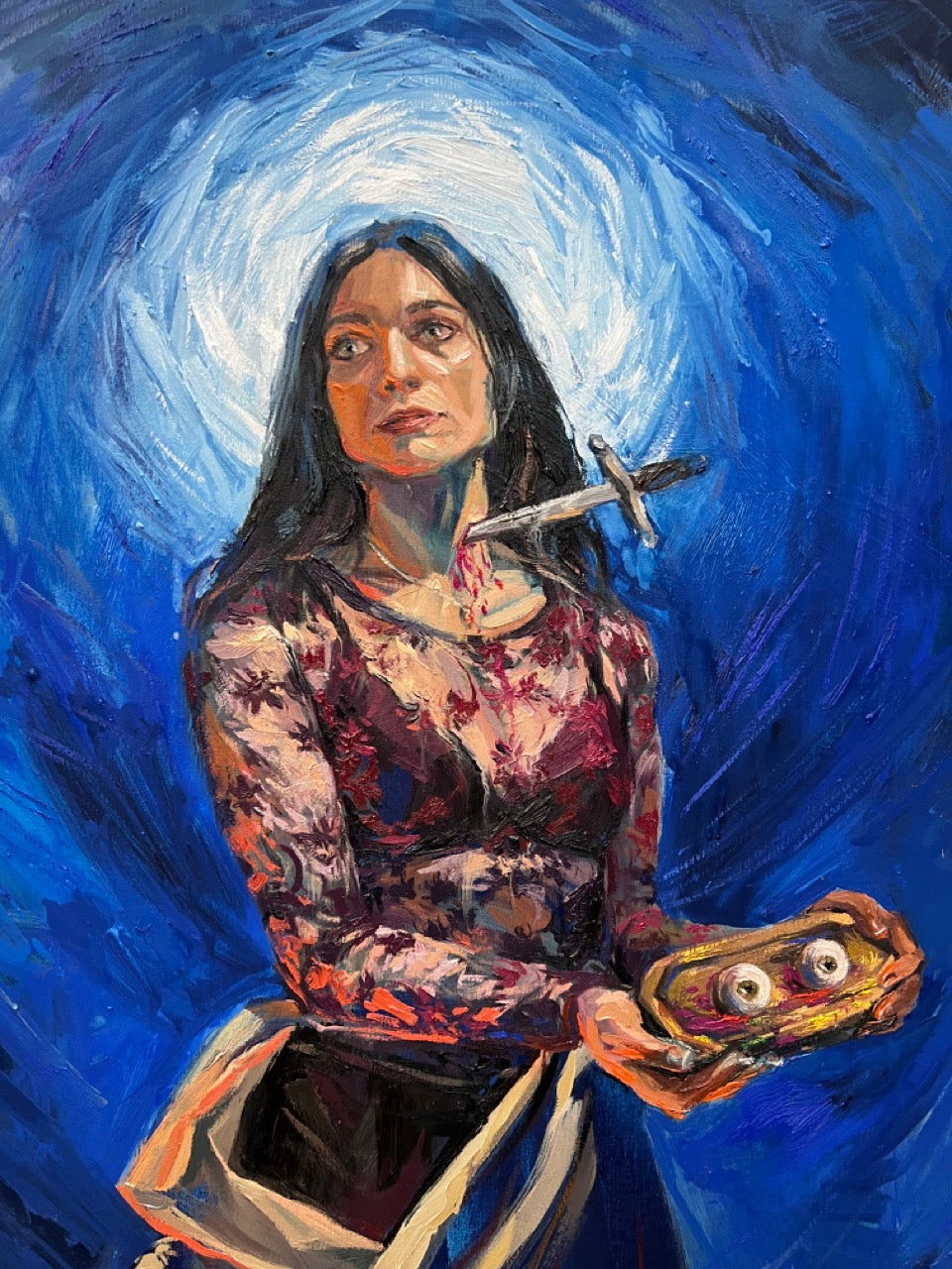 Ter aparece en esta imagen como Santa Lucía. Según cuenta la leyenda entregó todos sus bienes a los pobres y se sacó los ojos por no querer casarse con el hombre que eligieron para ella. Pero Dios vio su pureza y se los restituyó por otros aún más bellos. Los ojos en la bandeja de Ter simbolizan su mirada siempre distinta hacia el mundo. El cónsul Pascasio quiso que la llevasen a un lupanar para ser violada, ya que se negó a ofrecer ofrenda a sus dioses paganos ni tampoco quería casarse, pero ella dijo “Si la mente no consiente, el cuerpo no quedará mancillado”. Intentaron moverla con mil hombres pero no lo consiguieron. También lo intentaron con 2000 bueyes y tampoco. Esos bueyes, que simbolizan las vicisitudes que tienen los youtubers para hacer su trabajo, están simbolizados en el cuadro por los dos cráneos de la parte inferior. También llamaron a los magos y determinaron rociarla con orín caliente, lo cual tampoco dio resultado. Finalmente la intentaron quemar viva pero no ardía. Por último le clavaron una daga en la garganta y aún así seguía hablando antes de morir. La parte inferior de la obra simboliza todas las ideas que bullen en la cabeza de Ter, y que se cristalizan en sus vídeos. Su cabeza está iluminada como símbolo de su trabajo brillante. En la parte inferior aparecen dos hojas de palma, que simbolizan el oasis, la vida, y además es el atributo de los primeros santos. En este caso simbolizan a los primeros youtubers culturales que lograron éxito y repercusión en la plataforma.