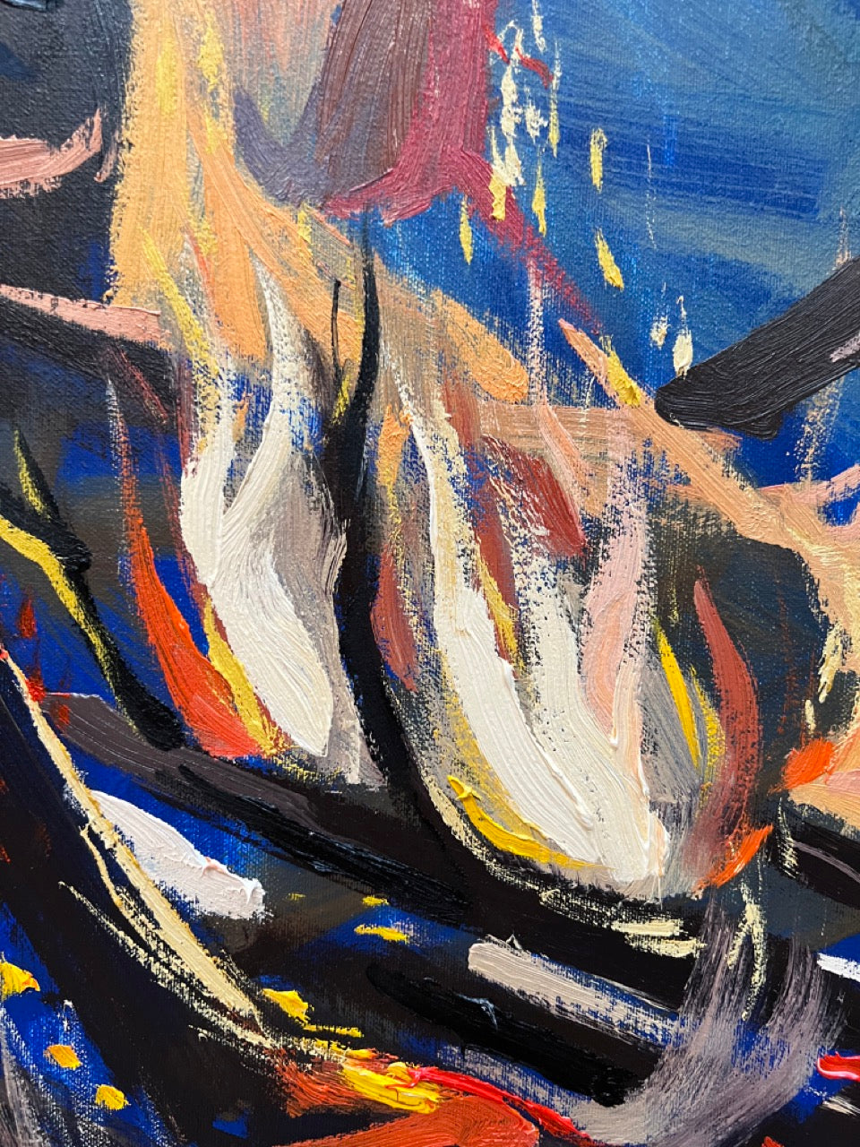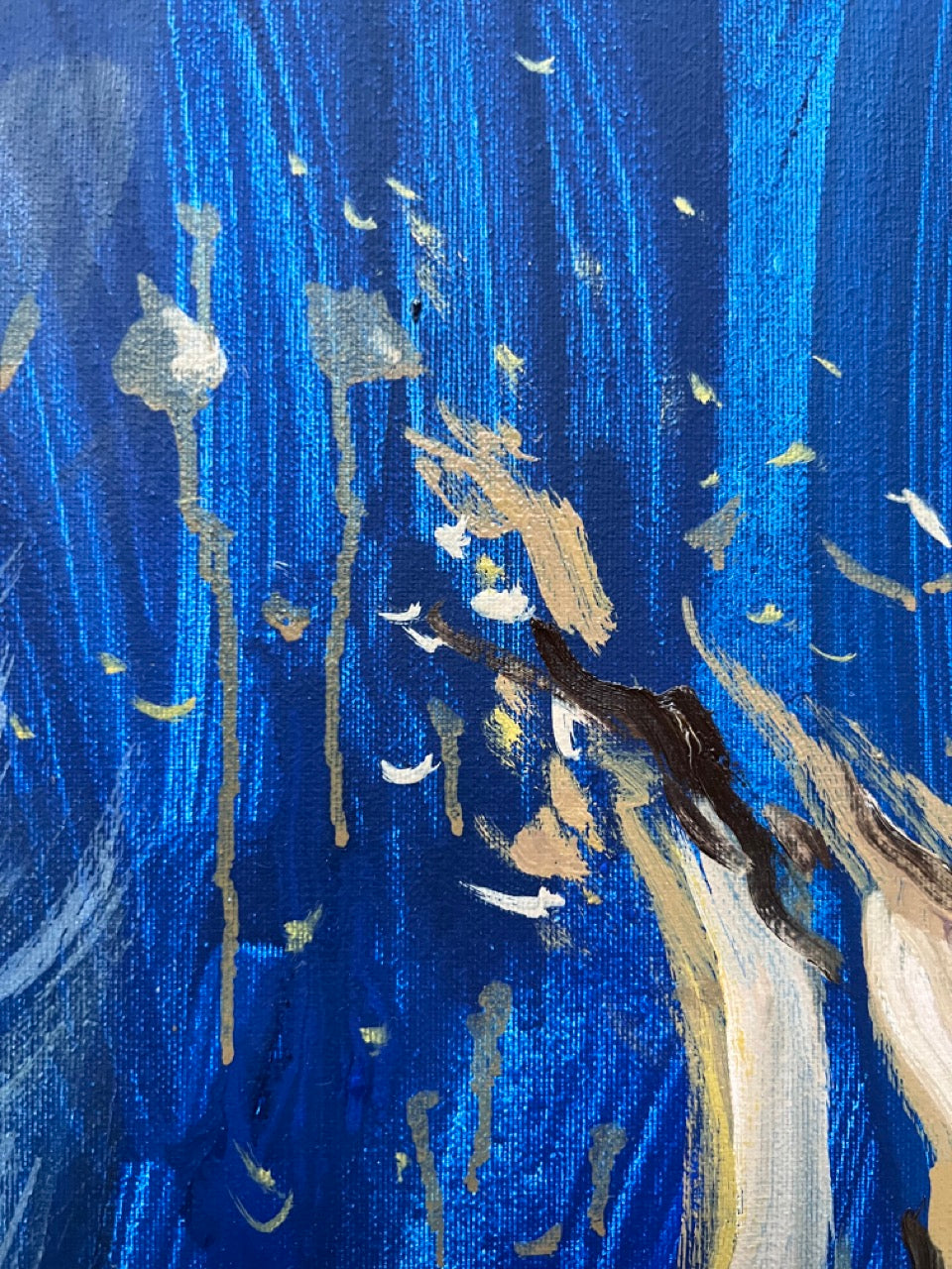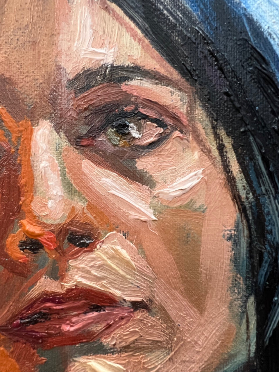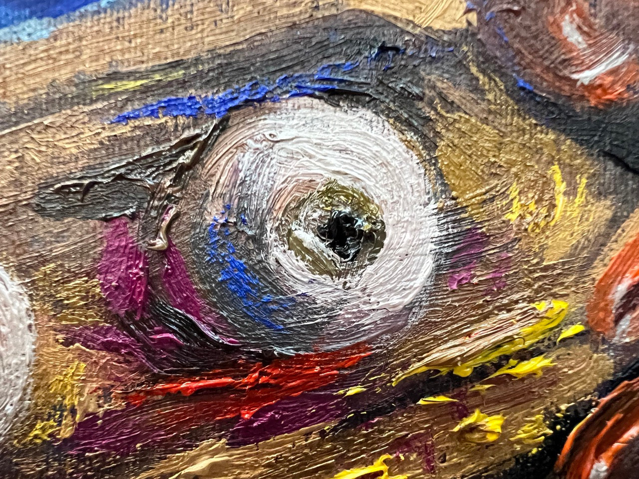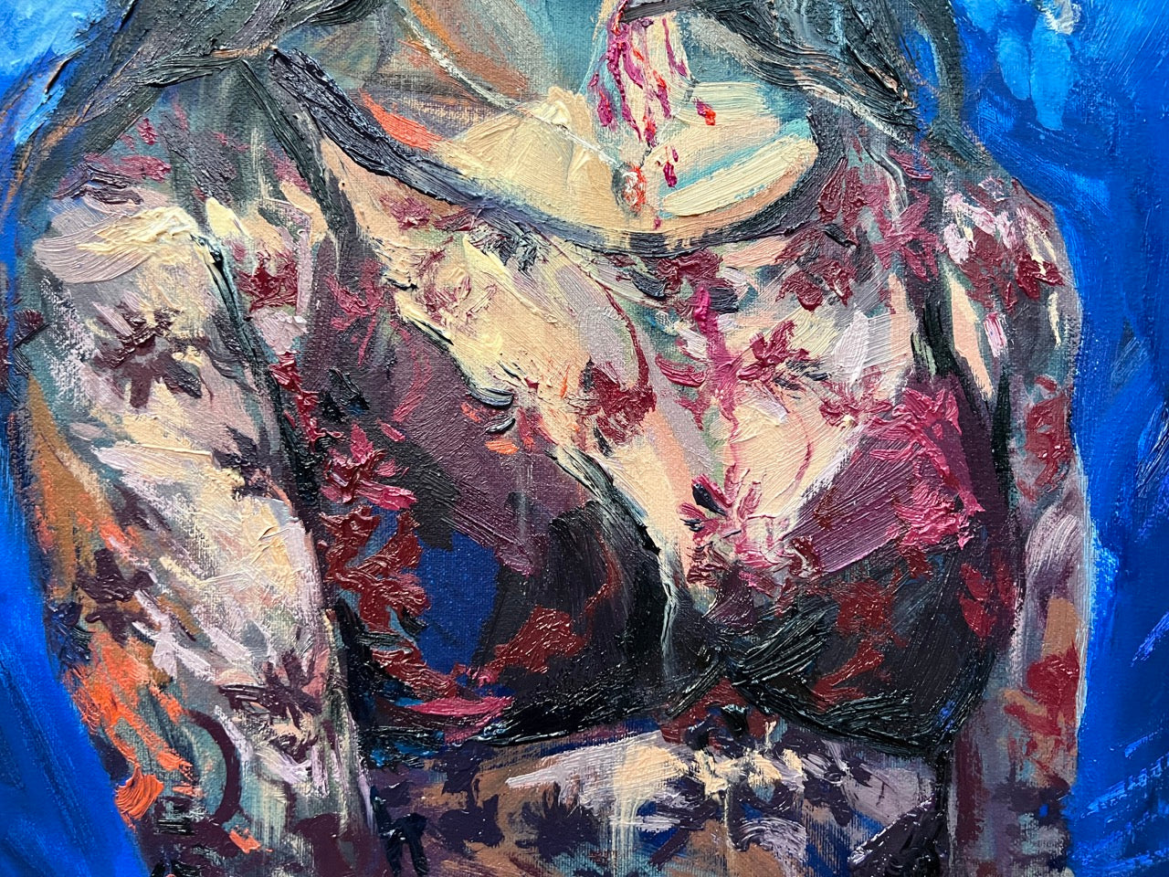Ter aparece en esta imagen como Santa Lucía. Según cuenta la leyenda entregó todos sus bienes a los pobres y se sacó los ojos por no querer casarse con el hombre que eligieron para ella. Pero Dios vio su pureza y se los restituyó por otros aún más bellos. Los ojos en la bandeja de Ter simbolizan su mirada siempre distinta hacia el mundo. El cónsul Pascasio quiso que la llevasen a un lupanar para ser violada, ya que se negó a ofrecer ofrenda a sus dioses paganos ni tampoco quería casarse, pero ella dijo “Si la mente no consiente, el cuerpo no quedará mancillado”. Intentaron moverla con mil hombres pero no lo consiguieron. También lo intentaron con 2000 bueyes y tampoco. Esos bueyes, que simbolizan las vicisitudes que tienen los youtubers para hacer su trabajo, están simbolizados en el cuadro por los dos cráneos de la parte inferior. También llamaron a los magos y determinaron rociarla con orín caliente, lo cual tampoco dio resultado. Finalmente la intentaron quemar viva pero no ardía. Por último le clavaron una daga en la garganta y aún así seguía hablando antes de morir. La parte inferior de la obra simboliza todas las ideas que bullen en la cabeza de Ter, y que se cristalizan en sus vídeos. Su cabeza está iluminada como símbolo de su trabajo brillante. En la parte inferior aparecen dos hojas de palma, que simbolizan el oasis, la vida, y además es el atributo de los primeros santos. En este caso simbolizan a los primeros youtubers culturales que lograron éxito y repercusión en la plataforma.