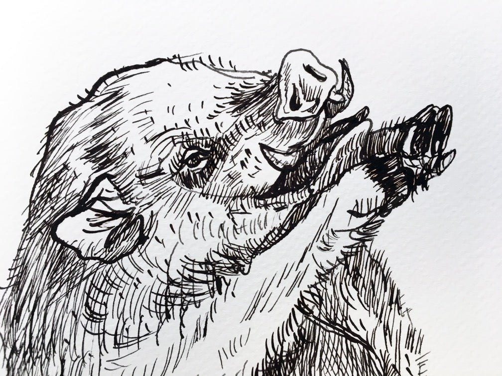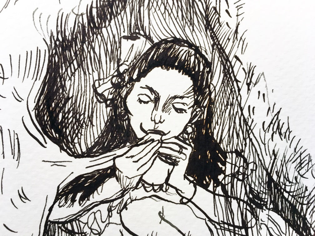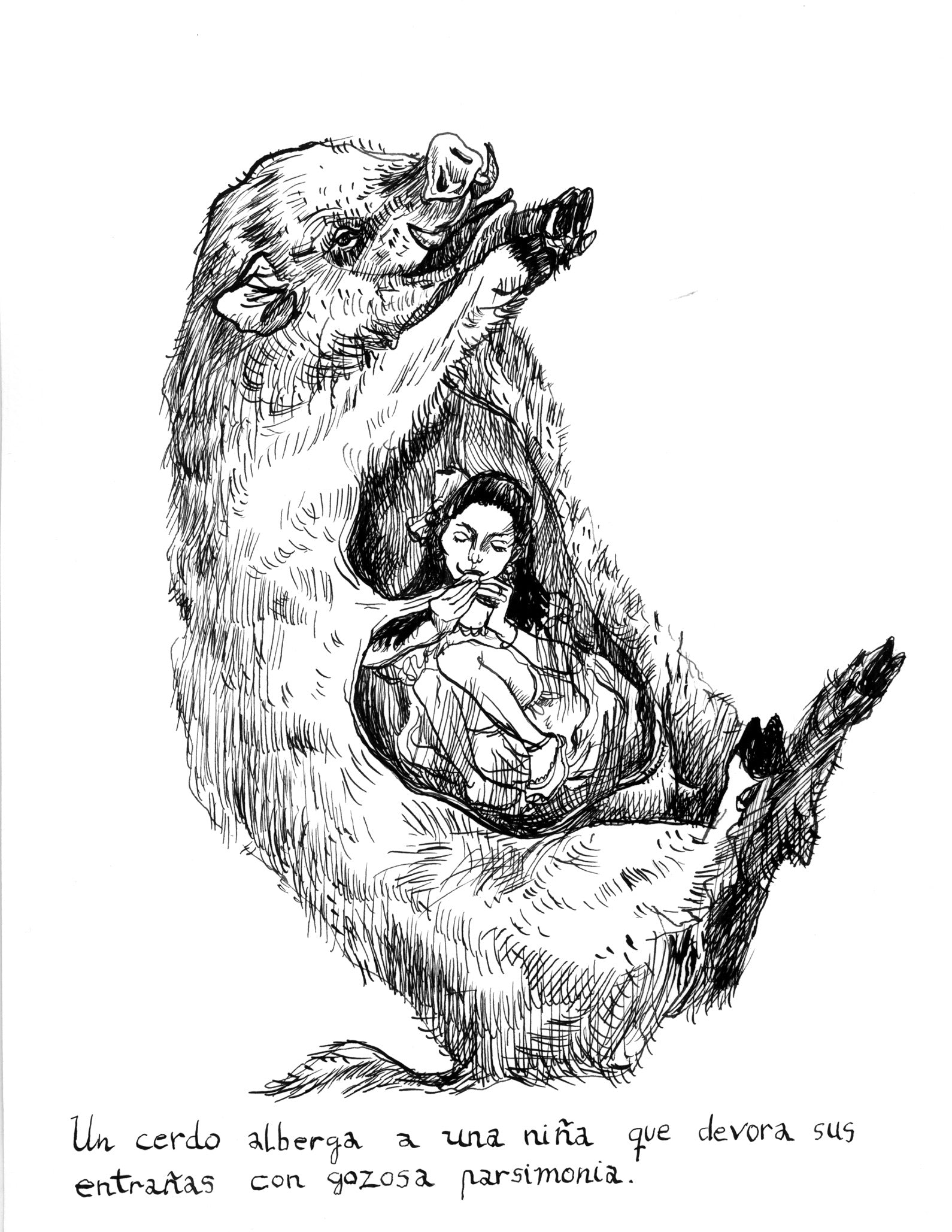 Un cerdo alberga a una niña que devora sus entrañas con gozosa parsimonia